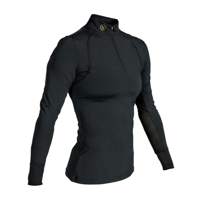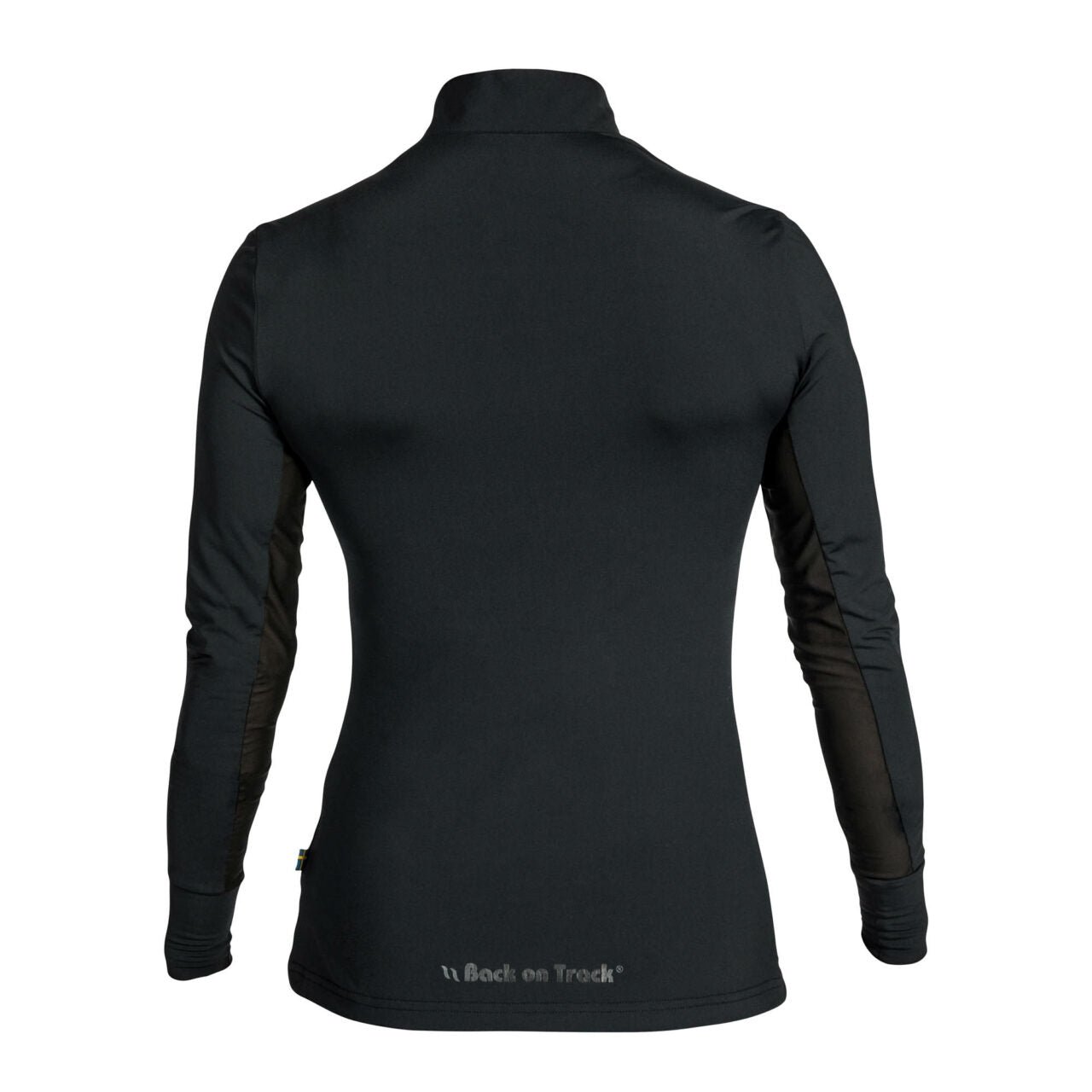 The Agnez long-sleeve women’s shirts are a form-fitting minimalist top with a structured stand-up collar, adorned with a discrete Back on Track wing emblem in matte gold. Agnez has a sleek, classic look, with a half-zip closure made from a lightweight functional fabric, which is highly breathable, wicks away moisture and dries quickly.