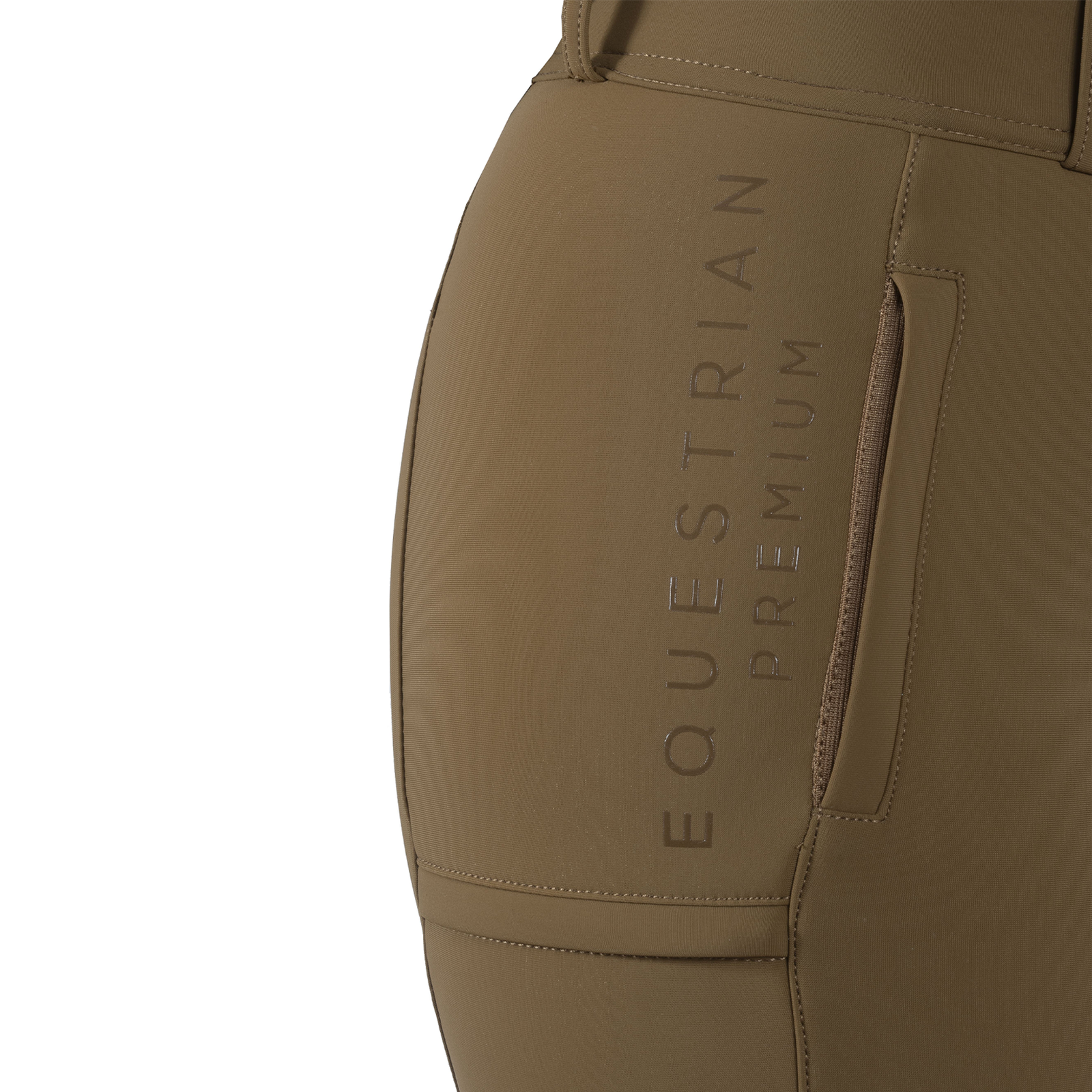 Elegant breeches made from a comfortable functional fabric. Closable seam pockets. Mobile phone pocket on the right thigh, can be closed with a zipper. High-quality heraldic logo embroidery on the side leg, decorated with gold-colored crystal stones. Two tonal horse embroideries at the hem. Elegant, tonal prints on the side leg and on the back yoke. Gold-colored details and highlights. Elastic leg cuffs, perfectly color-coordinated.