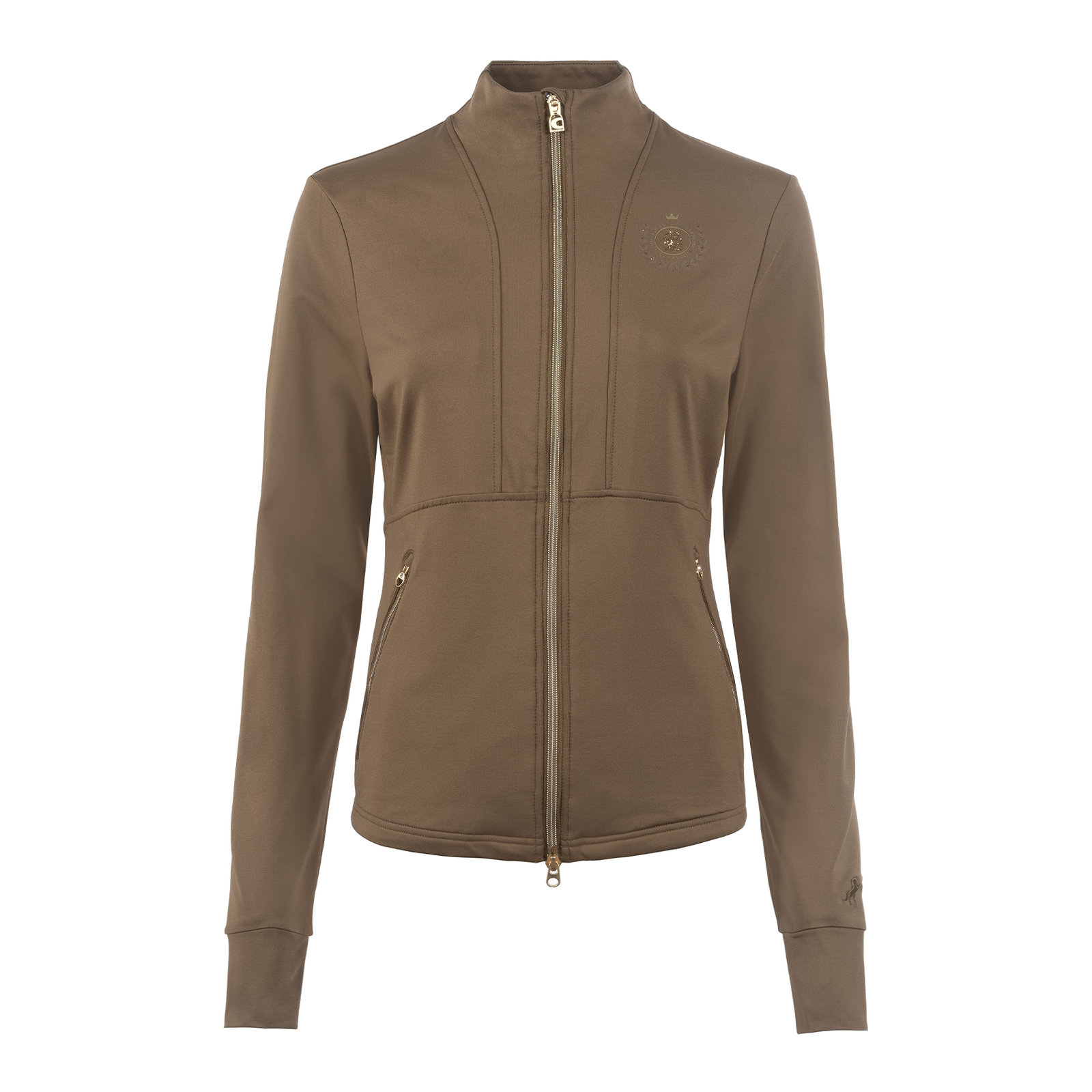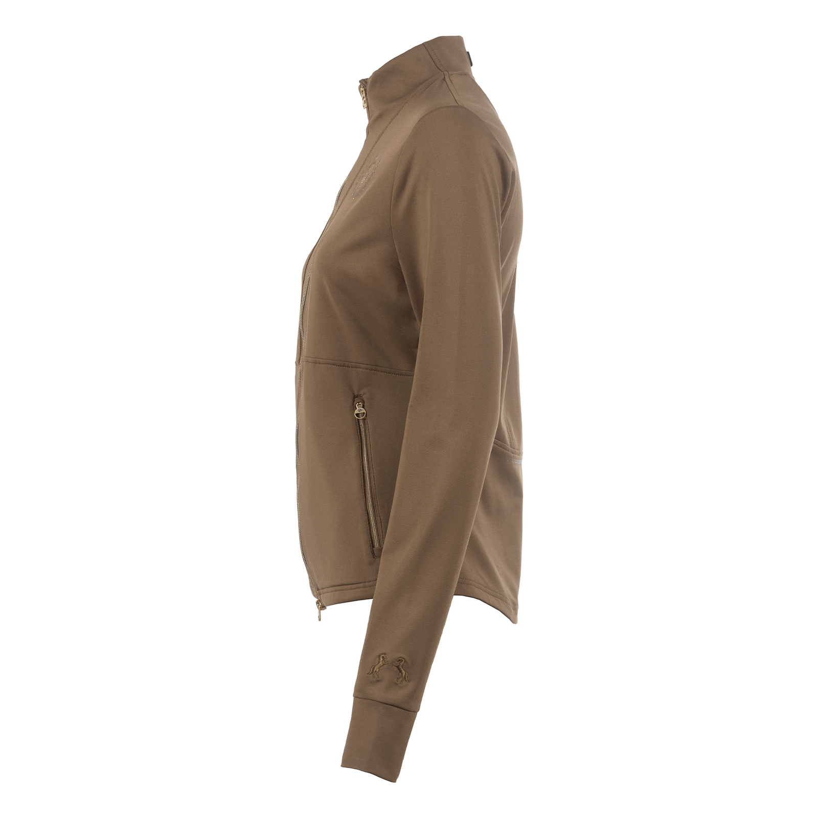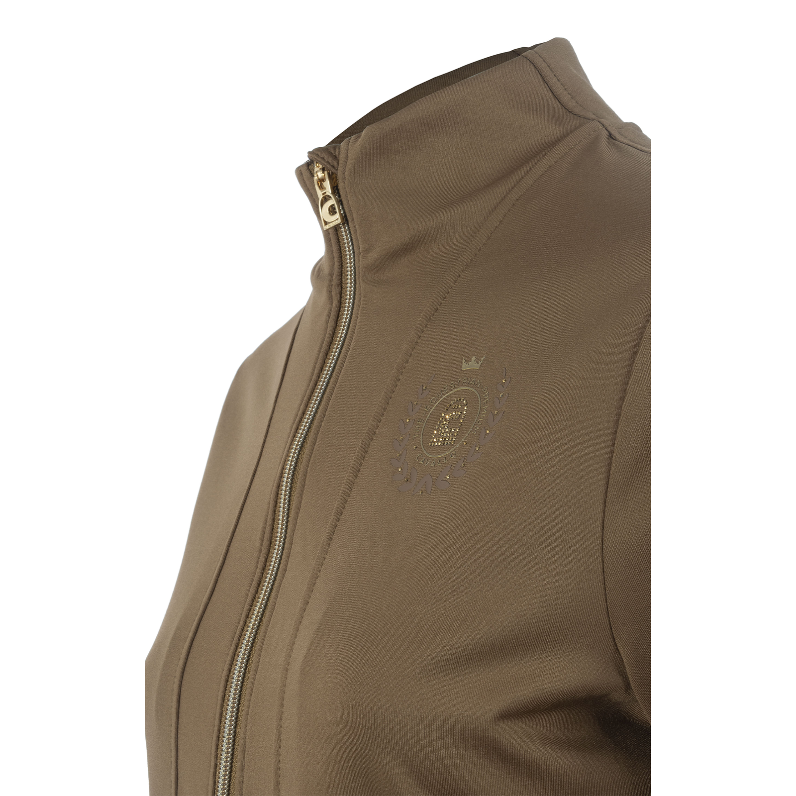 Elegantly tailored jacket with cut stand-up collar made from soft functional material. Bi-elastic fabric, softly brushed inside. High-quality, gold-colored 2-way front zipper and two front pockets. Zipper with gold-colored logo zipper pendant. Refined seams ensure an optimal and comfortable fit. Wide sleeve cuffs and two tonal horse embroidery on the left arm above the cuff. Gold-colored heraldic logo print and gold-colored crystal stones on the left chest. High-quality, gold and black Cavallo patch on the back of the collar. Gold-colored heraldic stirrup print on the back below the waist.