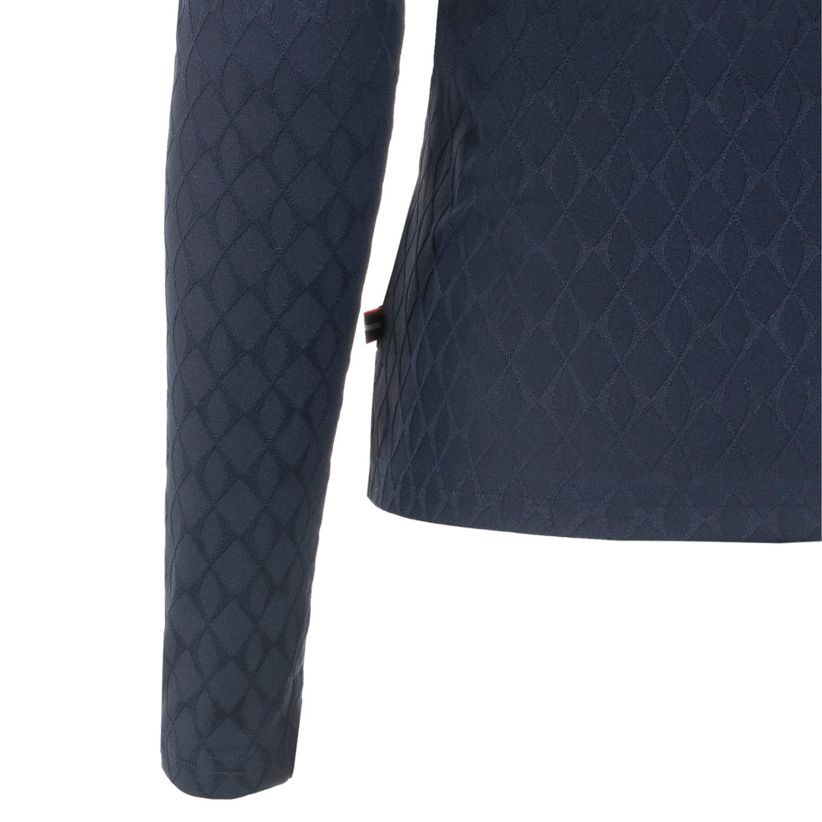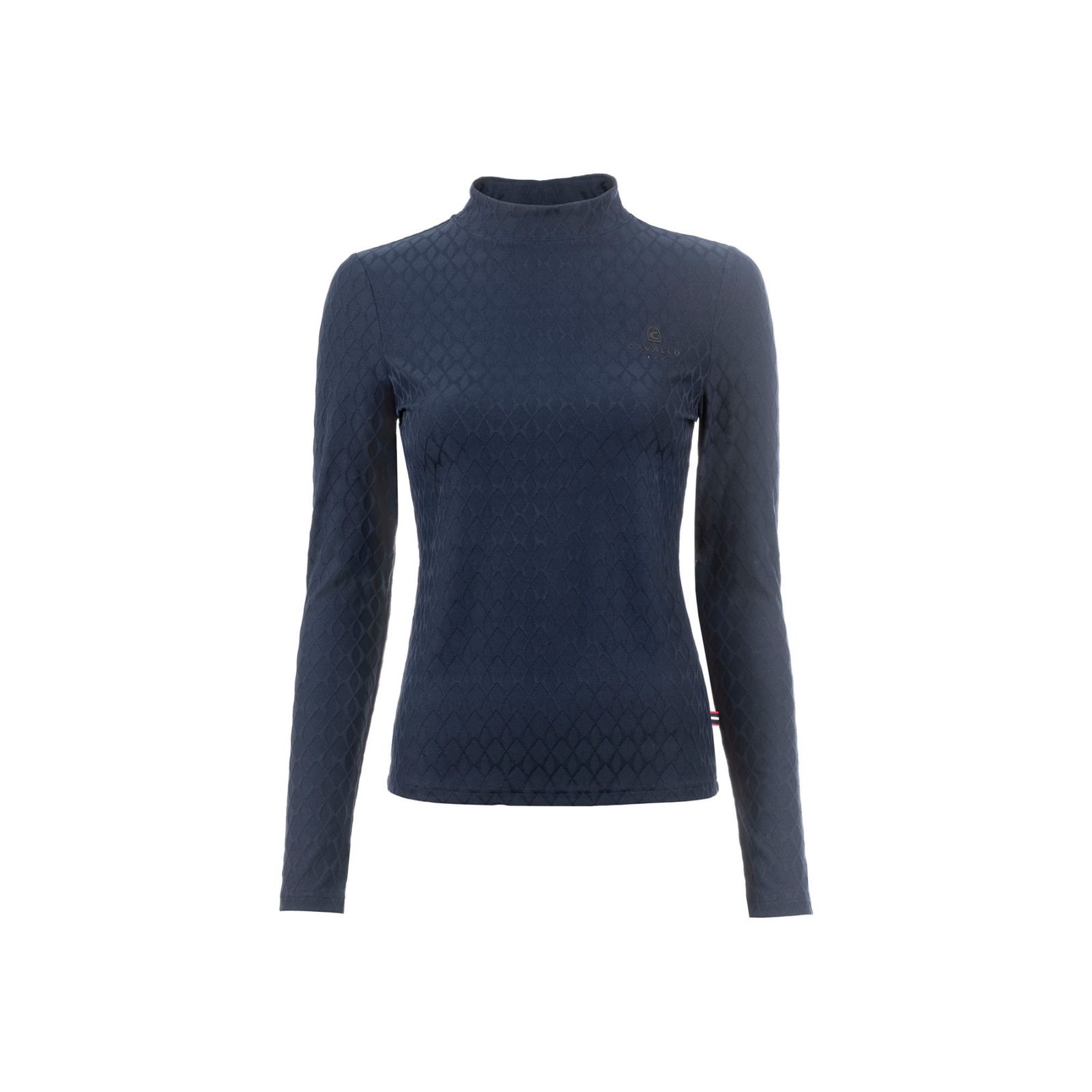 This Cavallo CavalRabia Ladies Long Sleeve Base Layer in navy features a stand-up collar crafted from soft, functional fabric for comfort and performance. It is detailed with a refined Cavallo 3D artwork on the left chest and a sparkling Cavallo stirrup made of crystal stones positioned centrally below the collar at the back, combining style with technical design.