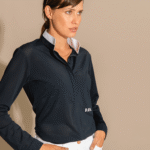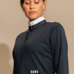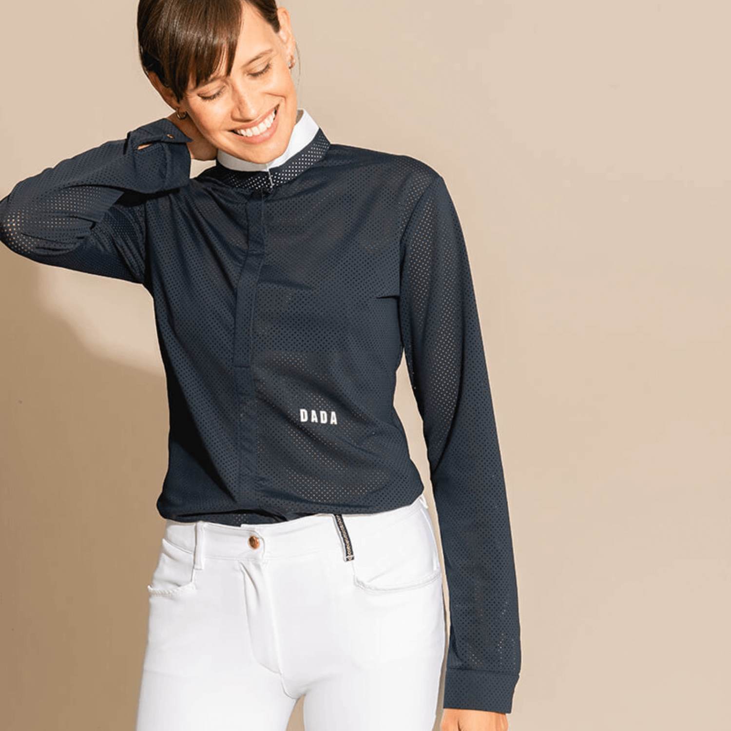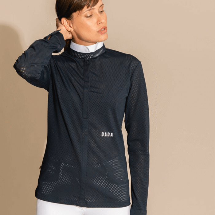 Technical polo shirt long sleeves microperforated, sleek design. Rigid officer collar and front opening, invisible buttons. DADA logo on the front left waistline—eco-responsible technical fabric.