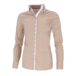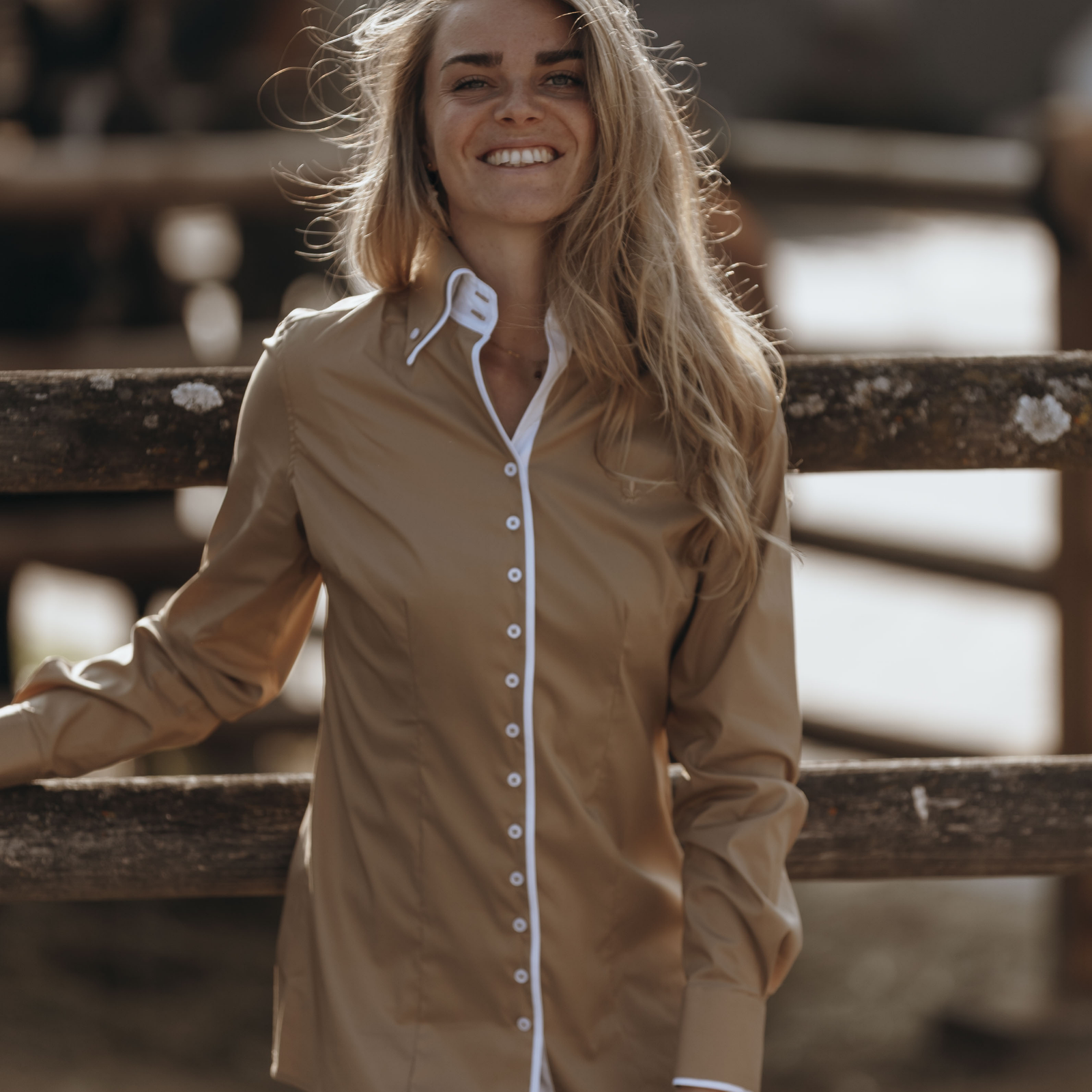 The stylish “Sally London B.” blouse impresses with a classic, timeless beige tone that combines elegance and versatility. The double collar and cuffs add sophisticated accents, while white details, such as fine piping on the front and the white collar stand, create a sophisticated contrast. Checked elements in the collar and cuffs give the blouse a unique and stylish touch.