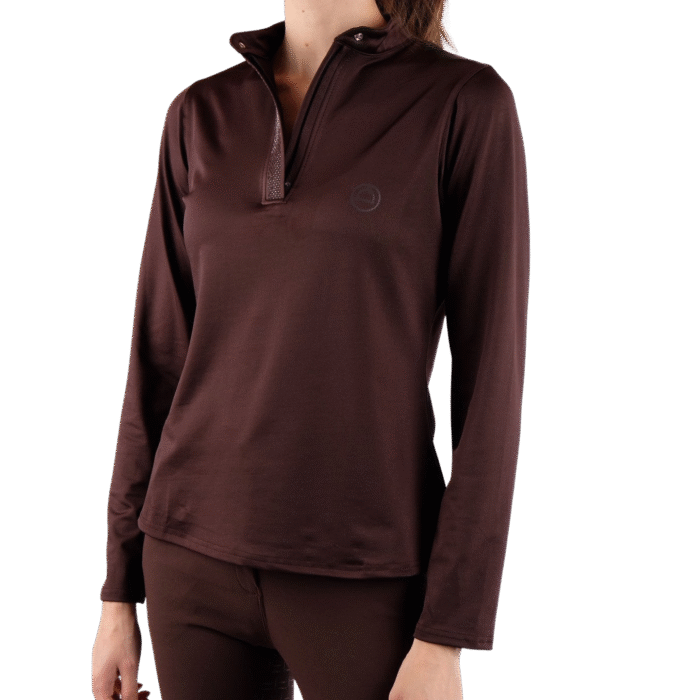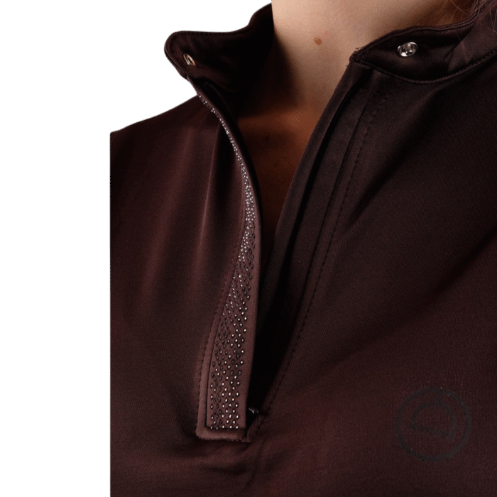 This Briella Crystal Shirt is a classic polo with black crystals with a neck zipper. The simple style means more space for your personality to spread out. The fabric has a smooth surface and is very comfortable. The highly functional fabric makes sure that the polo is sweat absorbent and breathable which ensures a comfortable feeling even when you work hard to achieve yours and your horses’ goals.