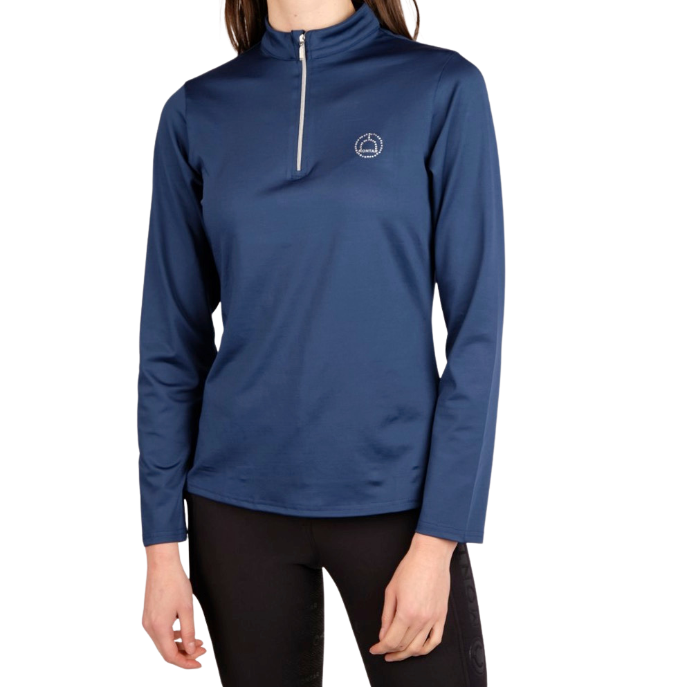 Everly Logo Polo with long sleeves and a low stand up collar. In the front is a silver neck zipper and on the left side of the chest is a Montar logo in clear crystals 4 cm in diameter. The perfect polo for your classic equestrian wardrobe. The highly functional Mon-tech fabric is breathable and sweat absorbent, which ensures a comfortable feeling even when you work hard riding your horse. Also available with short sleeves.