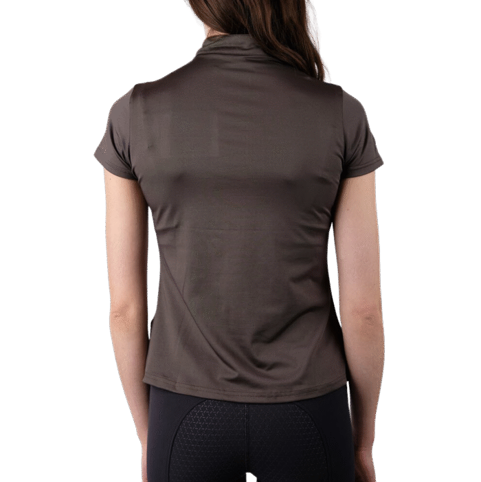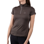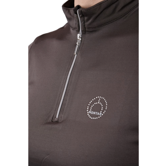 Everly Logo Polo with short sleeves and a low stand-up collar. In the front is a silver neck zipper and on the left side of the chest is a Montar logo in clear crystals. The highly functional Mon-tech fabric is breathable and sweat-absorbent, which ensures a comfortable feeling even when you work hard riding your horse. The perfect polo for training. Available in new spring colors.