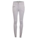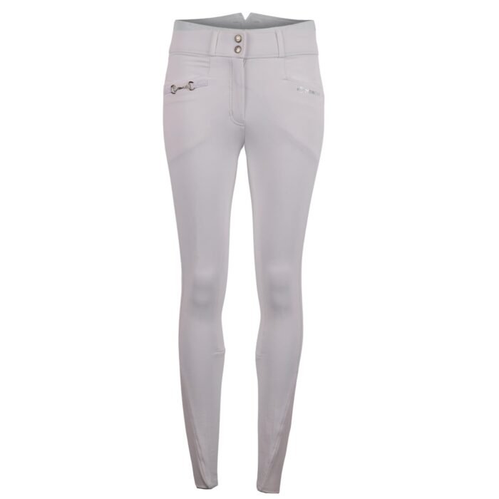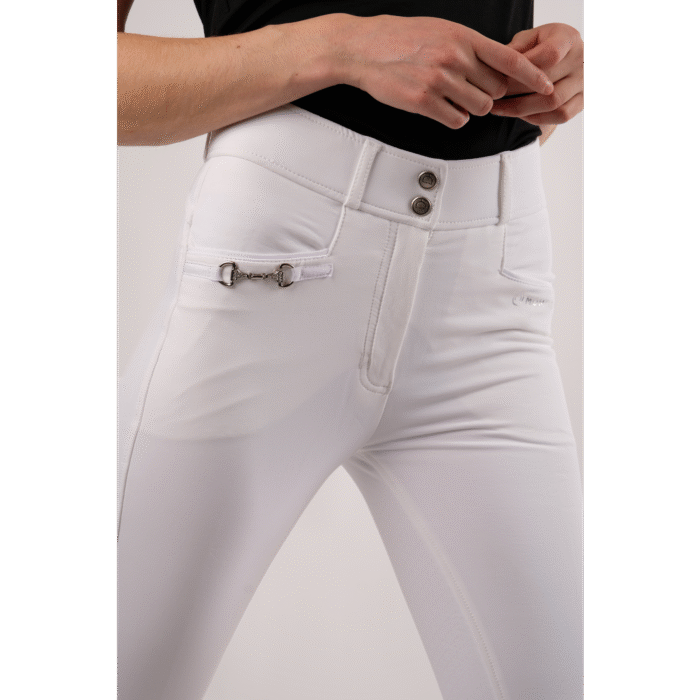 The Molly Model is part of our Essential Collection. These breeches are available in trendy high waist cut. The back has a v-cut in the waistband. That assure a tight fit at your waist. At the front there are 2 pockets, one decorated with a silver bit with small clear rhinestones on. At the ankle there is a lycra triangle for perfect fit.