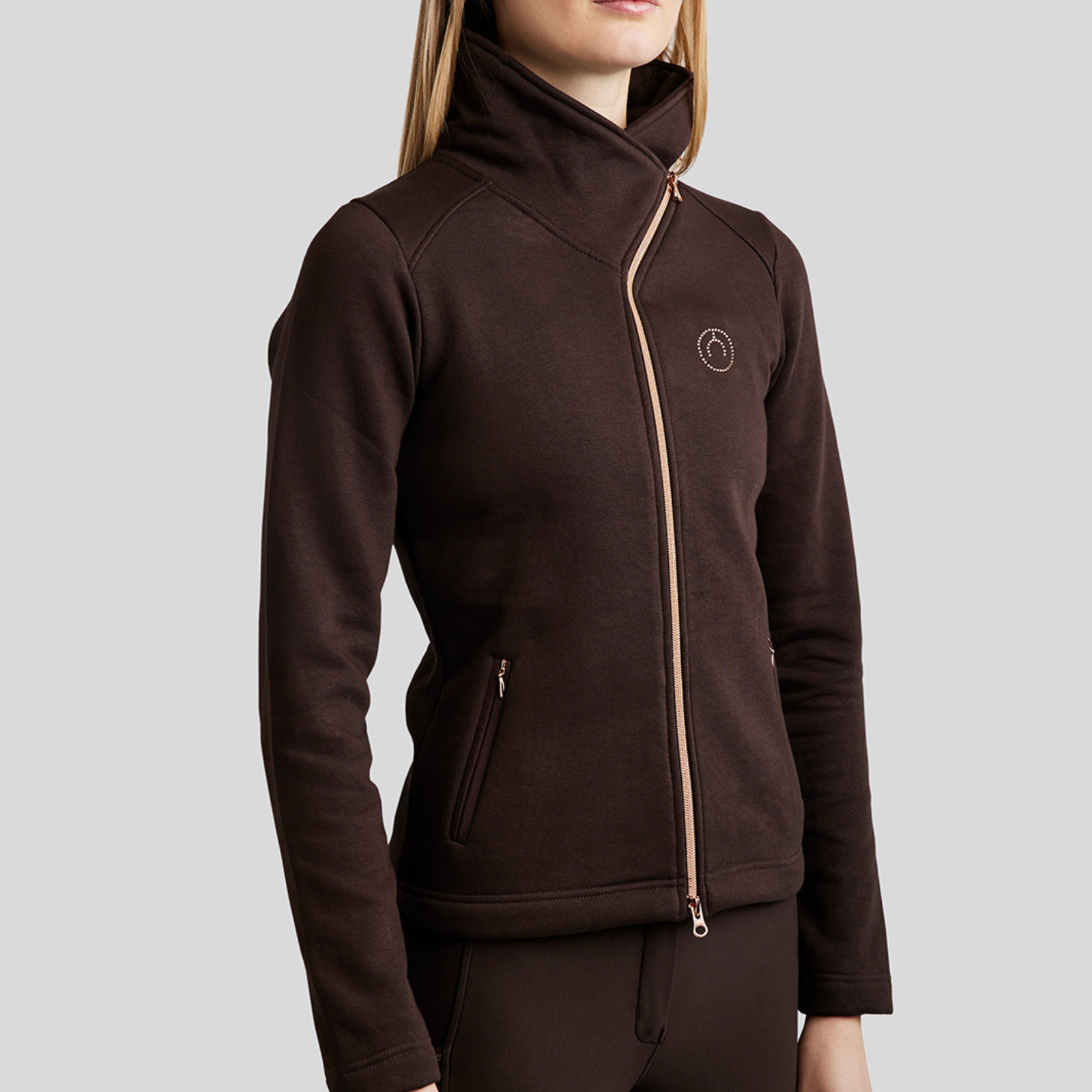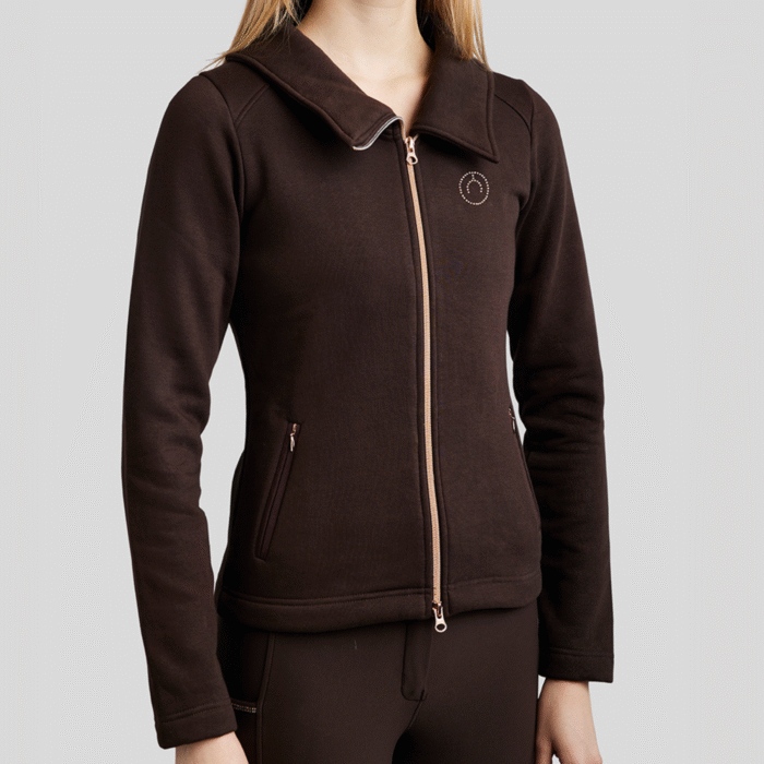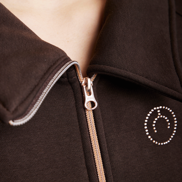 Introducing the Naja Sweatshirt with Rosegold Full Zipper and Crystals: a fusion of fashion and functionality. This sweatshirt, adorned with rose gold crystal details, features a Rosegold full zipper and convenient zipper pockets. Elevate your riding wear with a touch of elegance.
